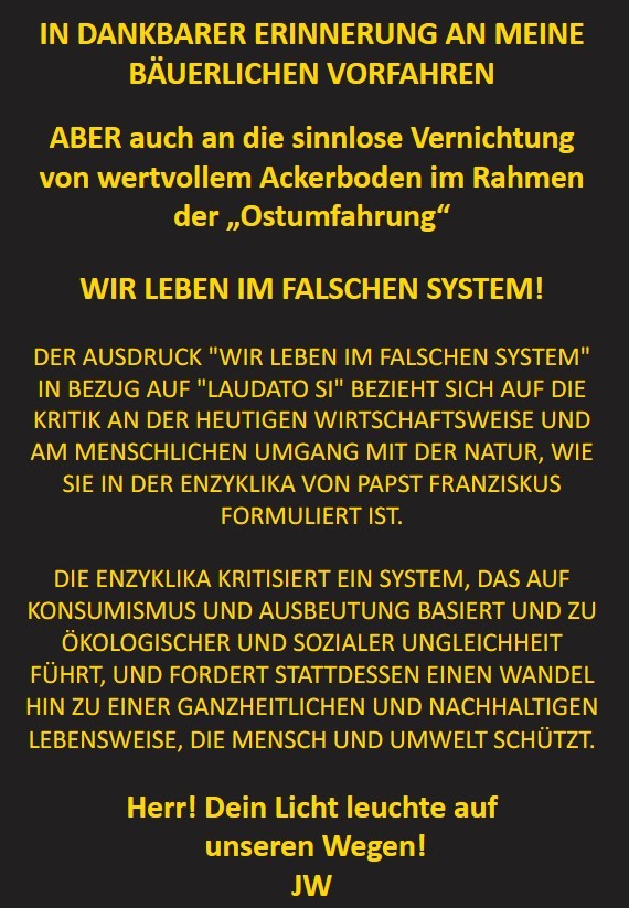Am Samstag 4.10. segnete der Rektor von St. Gabriel, P. Franz Pilz (SVD), ein Marterl in Wiener Neustadt, das in der Nähe der Ostumfahrungstrasse auf dem Acker von Josef Worm aufgestellt wurde. Das Marterl ist ein Mahnmal gegen "die sinnlose Vernichtung von wertvollem Ackerboden im Rahmen der Ostumfahrung“, wie Josef Worm auf der Tafel schreibt.
