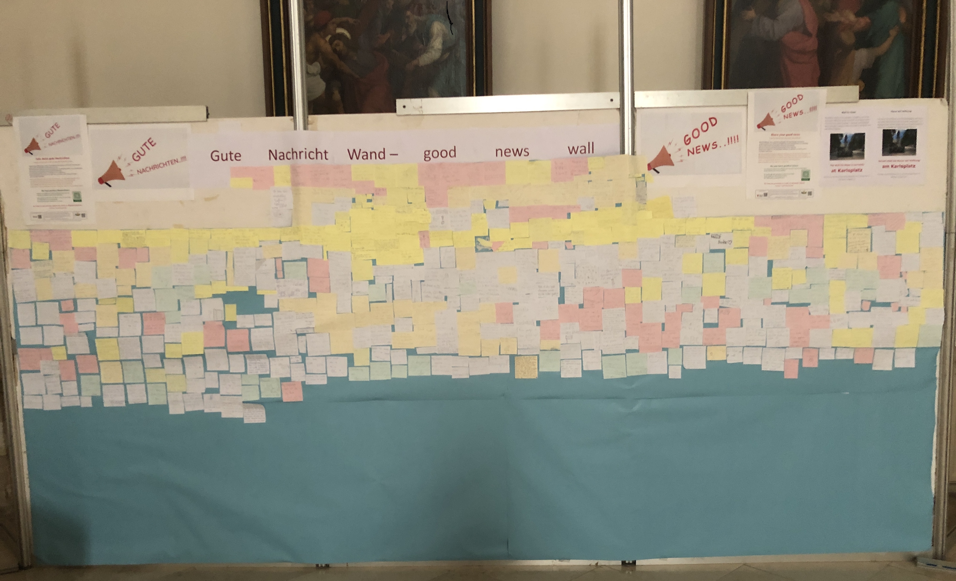 Bei der Aktion "good news" wurden Besucher:innen und Passant:innen auf Schildern in Deutsch und in Englisch eingeladen, ihre guten Nachrichten schriftlich zu Papier zu bringen und sie zu teilen in dem sie ihre „good news“ in den dafür vorgesehenen Postkasten an der „Mauer“ warfen. Das konnte auch elektronisch via QR-Code geschehen. All die guten Nachrichten wurden dann auf einer Wand in der Kirche veröffentlicht. Über denselben QR-Code kam man außerdem auf Webseiten, die ganz bewusst ausschließlich gute Nachrichten verbreiteten.